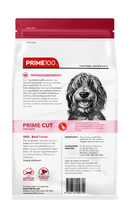 Our Australian, real meat protein SPD™ Prime Cut Beef Treats are made locally with the same care and attention as our entire range of Functional Protein Diets. All natural ingredients and no artificial colours or flavours. Feed as a treat or reward - Simply delicious!