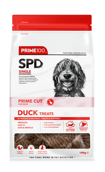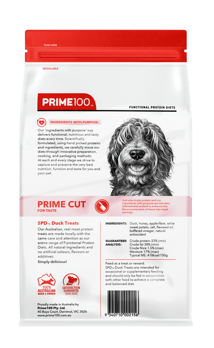 Our Australian, real meat protein SPD™ Prime Cut Duck Treats are made locally with the same care and attention as our entire range of Functional Protein Diets. All natural ingredients and no artificial colours or flavours. Feed as a treat or reward - Simply delicious!