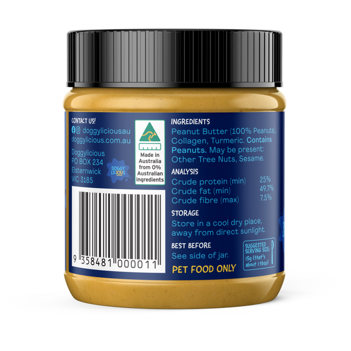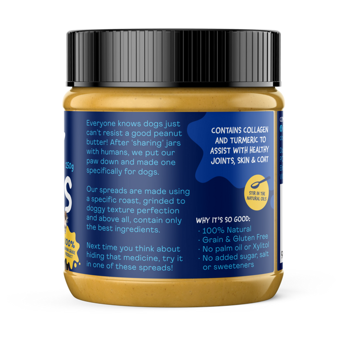 Everyone knows dogs love peanut butter. We wanted to put our paw down and make one specifically for dogs. Our doggy butters are made using a specific roast, ground to doggy texture perfection and above all contains only the best ingredients. All our doggy butters are made using human grade ingredients and 100% natural. This spread contains collagen and turmeric to assist with overall health of your dogs hips, skin and coat.